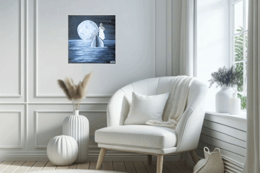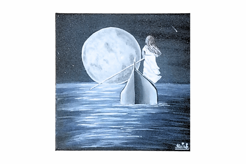 Na noční hladině, kde se ticho odráží o hvězdný prach, plula dívka v malé loďce. Její bílý šat se třpytil, jako by byl utkán z měsíčních paprsků. V rukou držela vesla, ale nebyla to ona, kdo určoval směr – byla to luna, co ji k sobě přitahovala, jako by byla její dávno ztracenou matkou, volající své dítě zpět do náruče.