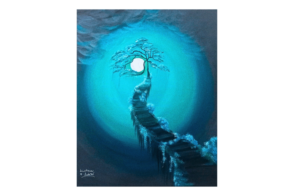 Na vrcholu stála stará osamělá koruna stromu, ověnčená měsíční září. Nebyl to obyčejný strom. Jeho větve byly jako ruce, které vítají. A jeho stín říkal: „Vítej. Už není kam jít, protože jsi tady. Jsi doma.“